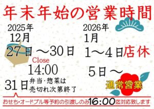 年末年始は営業時間を短縮する可能性がありますので随時ご確認ください。